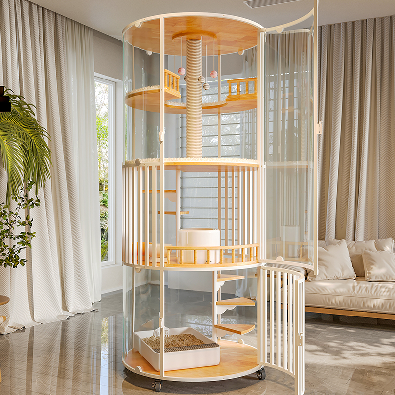 Cylindrical glass and a centered structural spine offer an unobstructed view from any side—ideal for retail merchandising, shelter adoption corners and vet observation. The round layout reduces corner stress points versus rectangular cages, improving durability and feline comfort. Keywords: 360-degree cat enclosure, panoramic cat villa, round glass cat house.