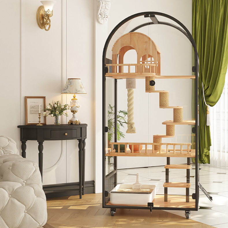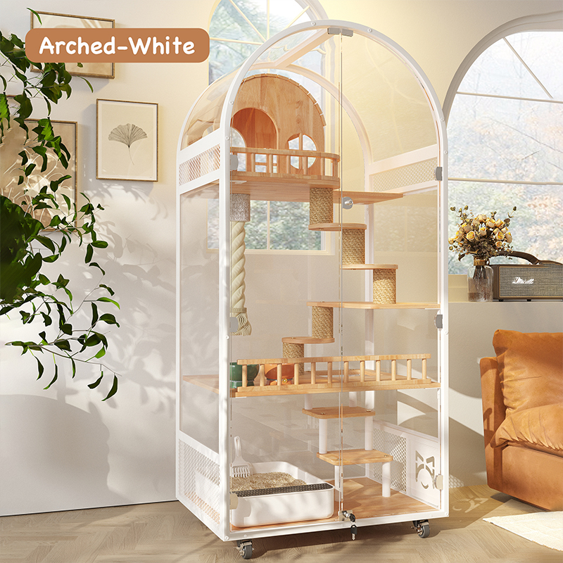 The continuous arch increases frame rigidity and distributes load evenly along the carbon-steel sidewalls, reducing rattle and vibration during use. The curved profile also maximizes headroom at the top deck, so cats can stretch fully without touching the ceiling.