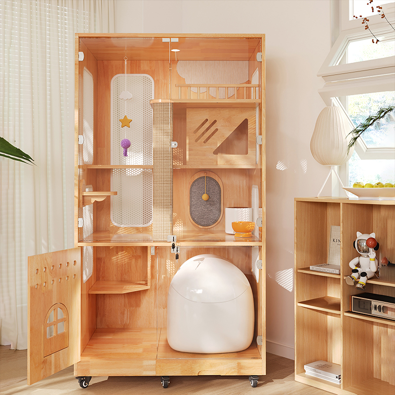 Platforms, hammocks, scratching posts, and ladders can be adjusted to suit different cats and customer requirements.